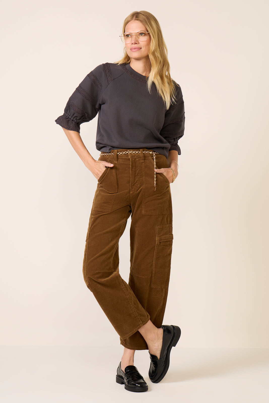 Delicate lace insets detail this stylish pullover sweatshirt by Rails. crafted from soft cotton French terry with a crew neckline. raglan puff sleeves. and ruffled lace cuffs.