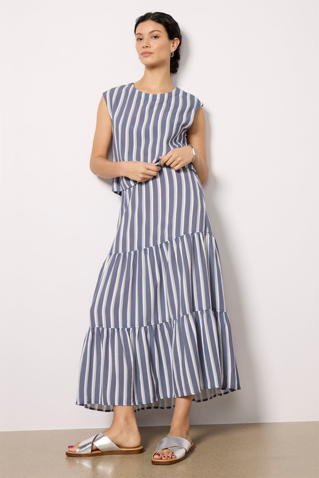 Finished in flowy seersucker fabric. the Cali stripe top by Cloth & Stone features a sleeveless. cropped silhouette with a crew neckline and back button closures. Pair with the matching Cali Stripe Skirt for a chic two-piece set.