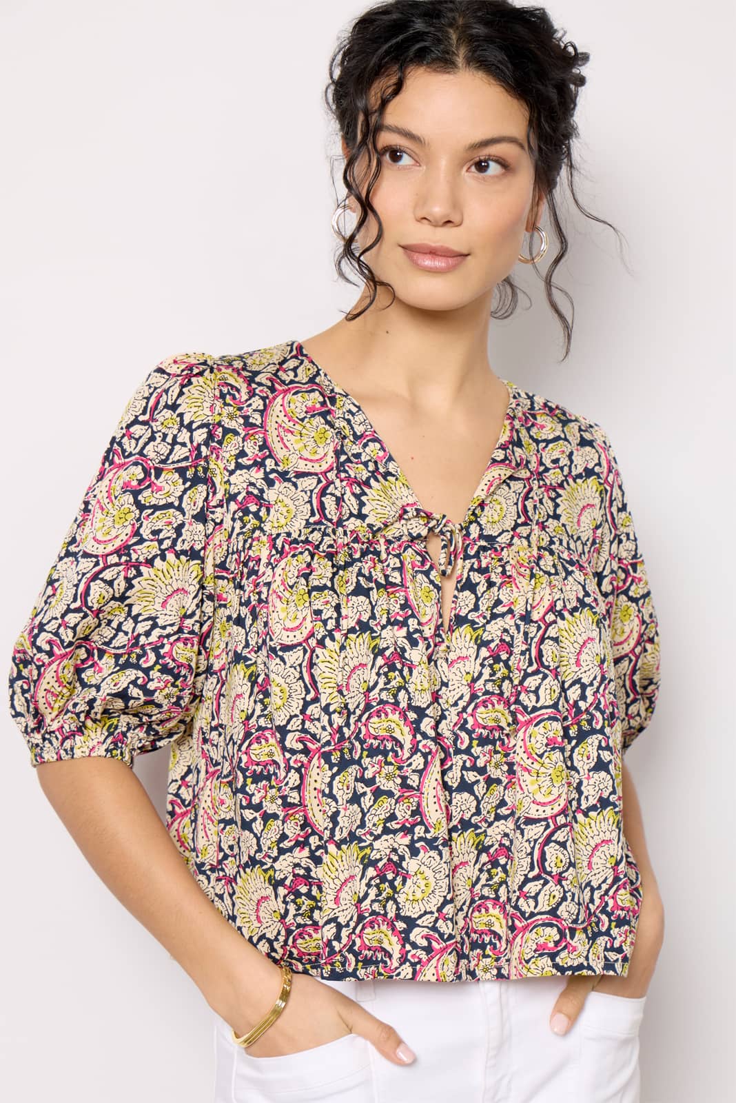 Flowy. feminine. and perfect for your spring rotation. Crafted in organic cotton. thisprintedtop by Emerson Fry features elbow-length puff sleeves and a v-neckline with double ties.